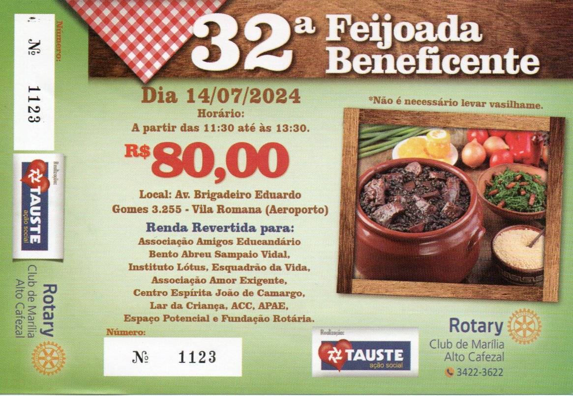 No próximo domingo, 14 de julho, acontece a 32ª edição da Feijoada Beneficente realizada pelo Rotary C. Marília Alto Cafezal. Evento tradicional, em prol de diversas entidades assistenciais. É entregue na sede do clube, embalada em vasilhames apropriados (feijoada, arroz e farofa) e serve até 4 pessoas.