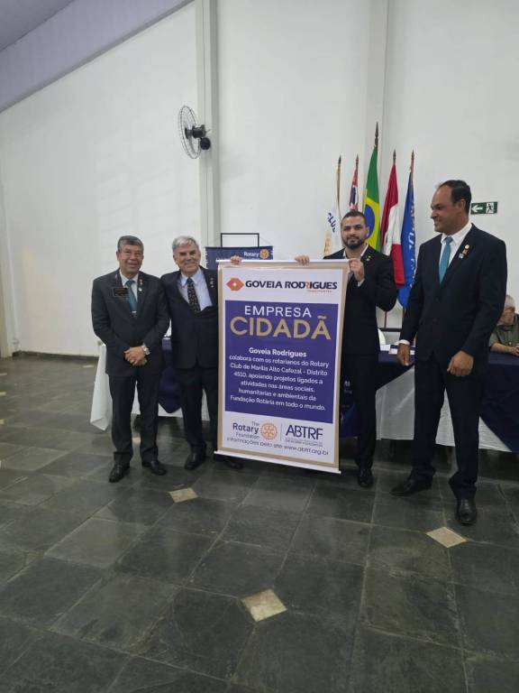 A reunião prosseguiu com a apresentação ao Clube e ao Governador Rotário, da empresa Transportes Goveia Rodrigues, que passa a receber o título de “Empresa Cidadã”, por sua adesão e colaboração com o Programa da ABTRF – Associação Brasileira da The Rotary Foundation. Valmir Thomé, Diretor da Comissão da Fundação Rotária do Clube, apresentou o Banner de Divulgação da ação, que foi exibido aos presentes pelo Governador Distrital e pelo Presidente do Clube.