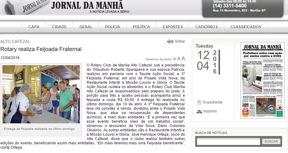 Em sua edição desta 3ª feira, 12 de abril de 2016, o Jornal da Manhã, um dos mais importantes jornais diários da cidade de Marília, destacou a realização da 3ª Feijoada Fraternal realizada pelo Rotary Club de Marília Alto Cafezal no domingo, dia 10 de abril.