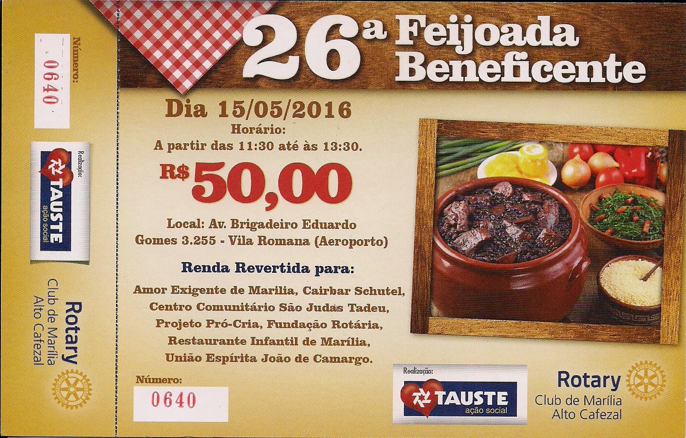 No domigo, 15 de maio, o Rotary Club de Marília Alto Cafezal realizou mais uma feijoada beneficente, evento que visa angariar fundos para diversas entidades da comunidade mariliense. Já em sua 26ª edição, a tradicional FEIJOADA DO ALTO CAFEZAL contou mais uma vez com a colaboração dos Supermercados Tauste, através do Tauste Ação Social, que patrocina parte dos ingredientes utilizados. A receita financeira destinou-se às seguintes entidades: Associação Amor Exigente de Marília, Associação Caibar Schutel, Centro Comunitário São Judas Tadeu, Projeto Pró-Cria, Restaurante Infantil de Marília, União Espírita João de Camargo e Fundação Rotária. Haverá também uma destinação ao Esquadrão da Vida de Marília.